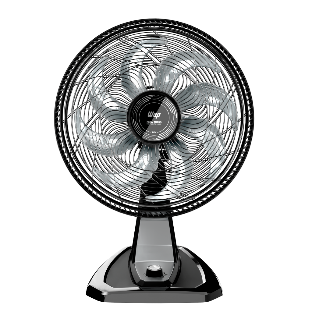 Ventilador WAP FLOW TURBO 2 em 1: 180W, 3 velocidades, tecnologia Silent Flow e design aerodinâmico para conforto e eficiência energética.